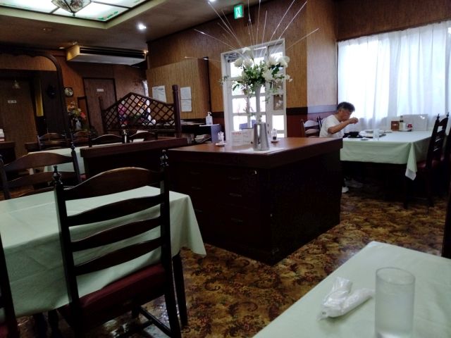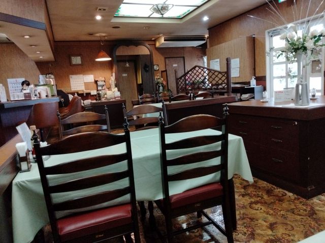 【薄水色のテープルクロス 昭和モダンの喫茶店という雰囲気ですね】