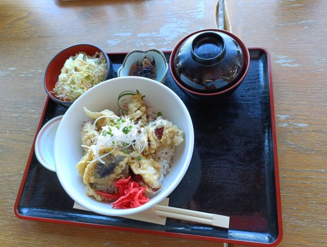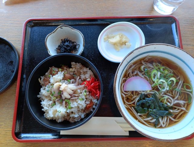 【早めの昼食は、K:たこ天丼 F:たこ飯withそば】