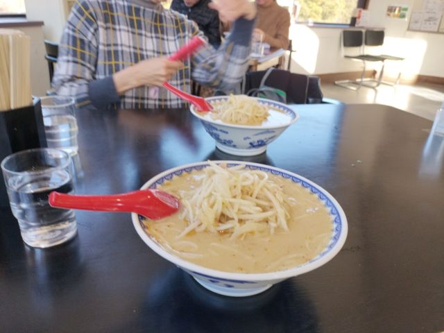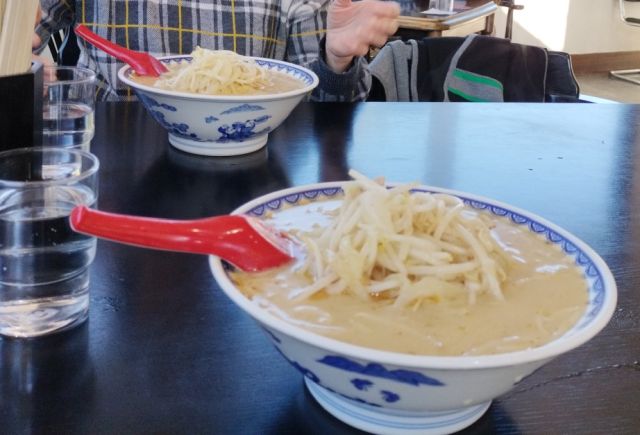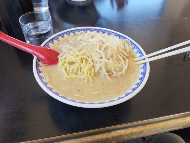 【もやしをこじあけると、中太縮れ麺が出てきました】